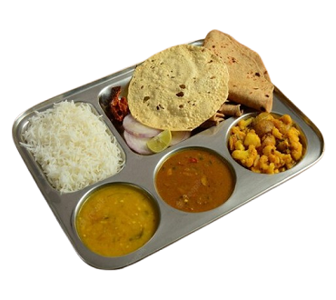 A wholesome Veg Thali served with flavorful dal, steamed chawal, fresh seasonal sabji, 4 soft rotis and salad. Perfectly balanced, homely, and made to give you a complete and satisfying meal.